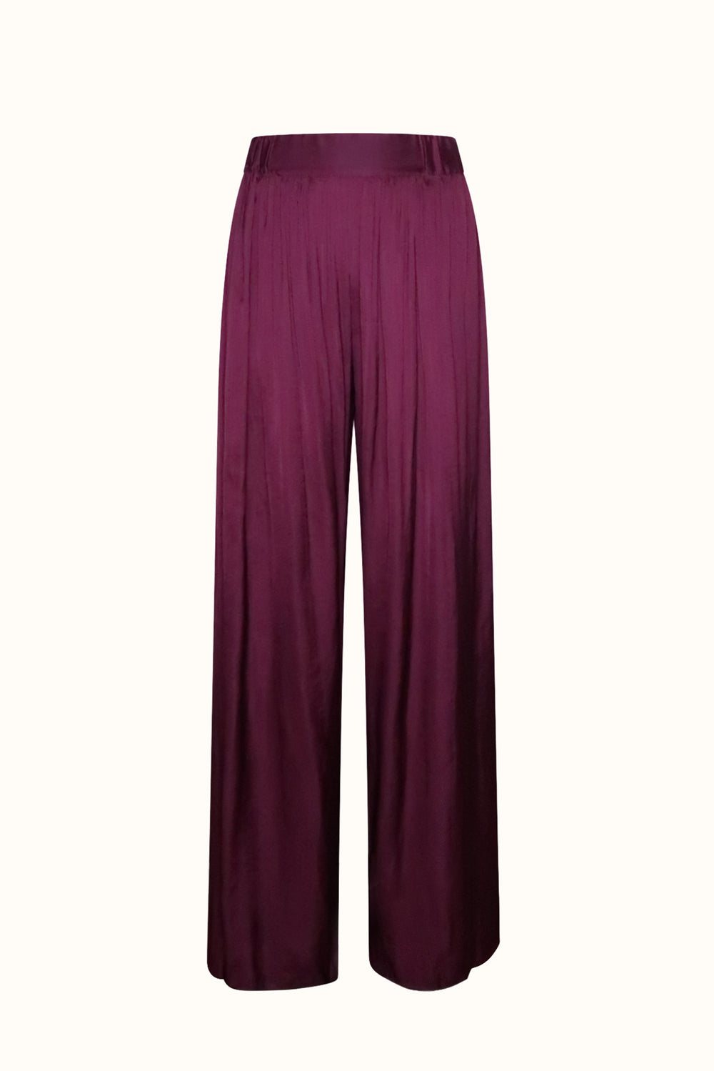 Our classic Stream Pant is back in this luxurious aubergine iteration! Enjoy superior softness and effortless airiness from its silken fabric. This timeless piece boasts a high waist, an elastic waistband, and wide, graceful legs, letting you make a statement without sacrificing comfort. Be fashionable and comfy all season long with Stream Pant Aubergine!