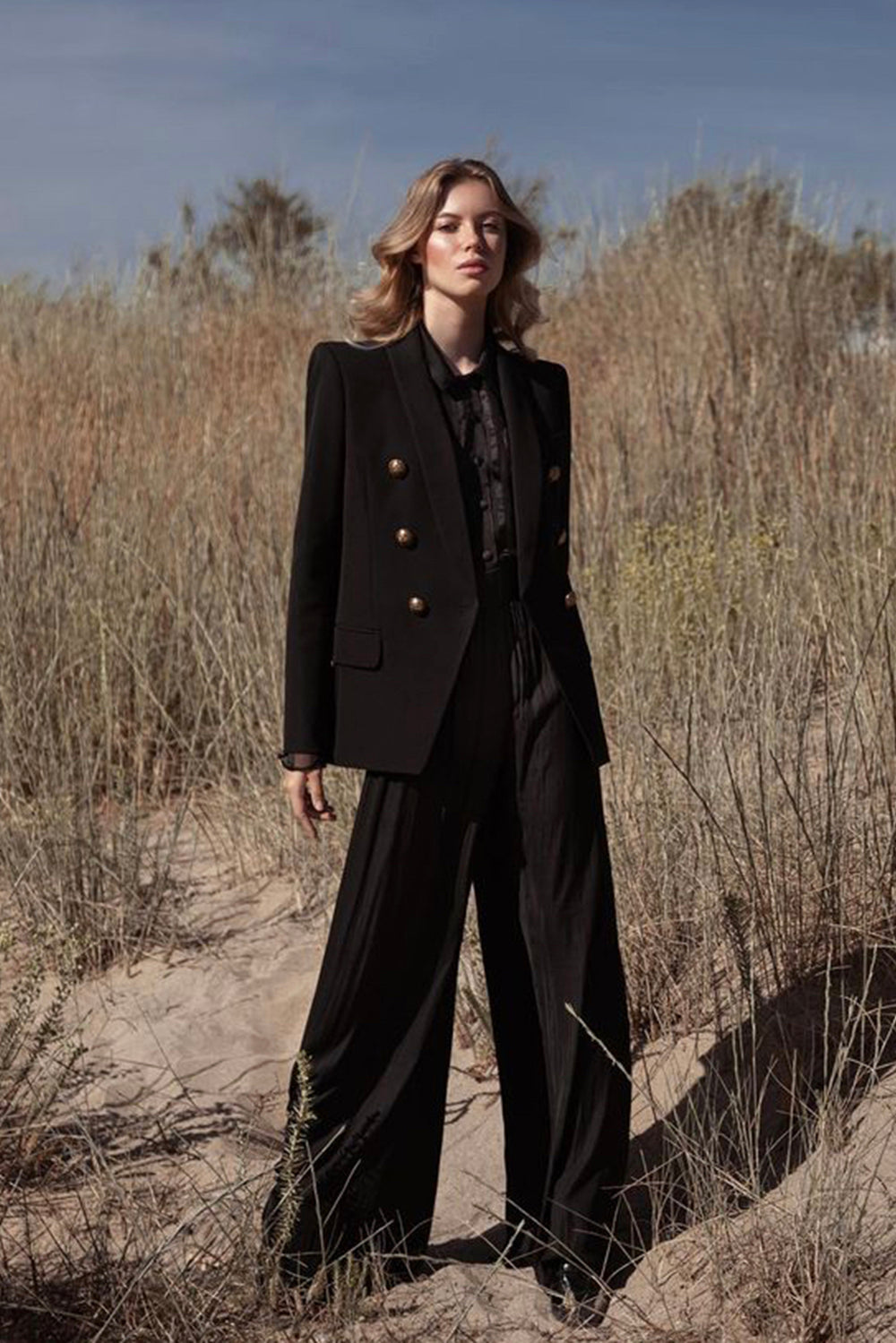 This is timeless pant for any wardrobe and especially great for traveling. I love wearing all my stream pants with a bodysuit and blazer for a sexy look, or casual with the cropped âmes jacket. I rotate between sneakers with the waistband rolled twice and then dress them up with heals for a night out on the town.