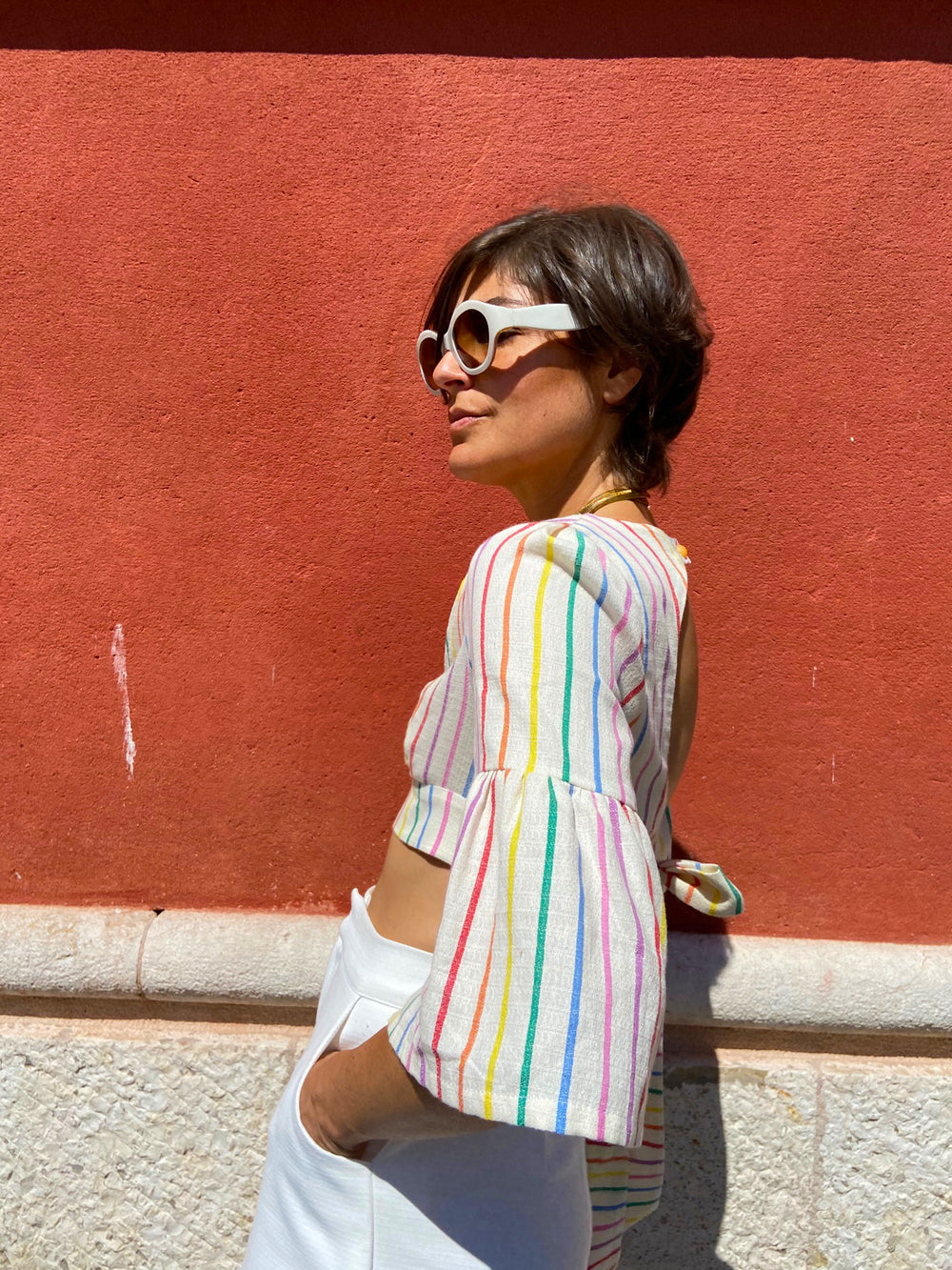 The ONE Top is the ONE top you need for summer. Featuring a slightly criss-crossed v-neck front, a heart shaped open back with back neck button closure, romantic, short sleeve shirred sleeves mimicking our classic FLOW Top, and a long belted band that can be tied in a bow in the back, or wrapped back around and tied in the front, this fun and nostalgic iteration of the ONE Top will remind you to be one with yourself.