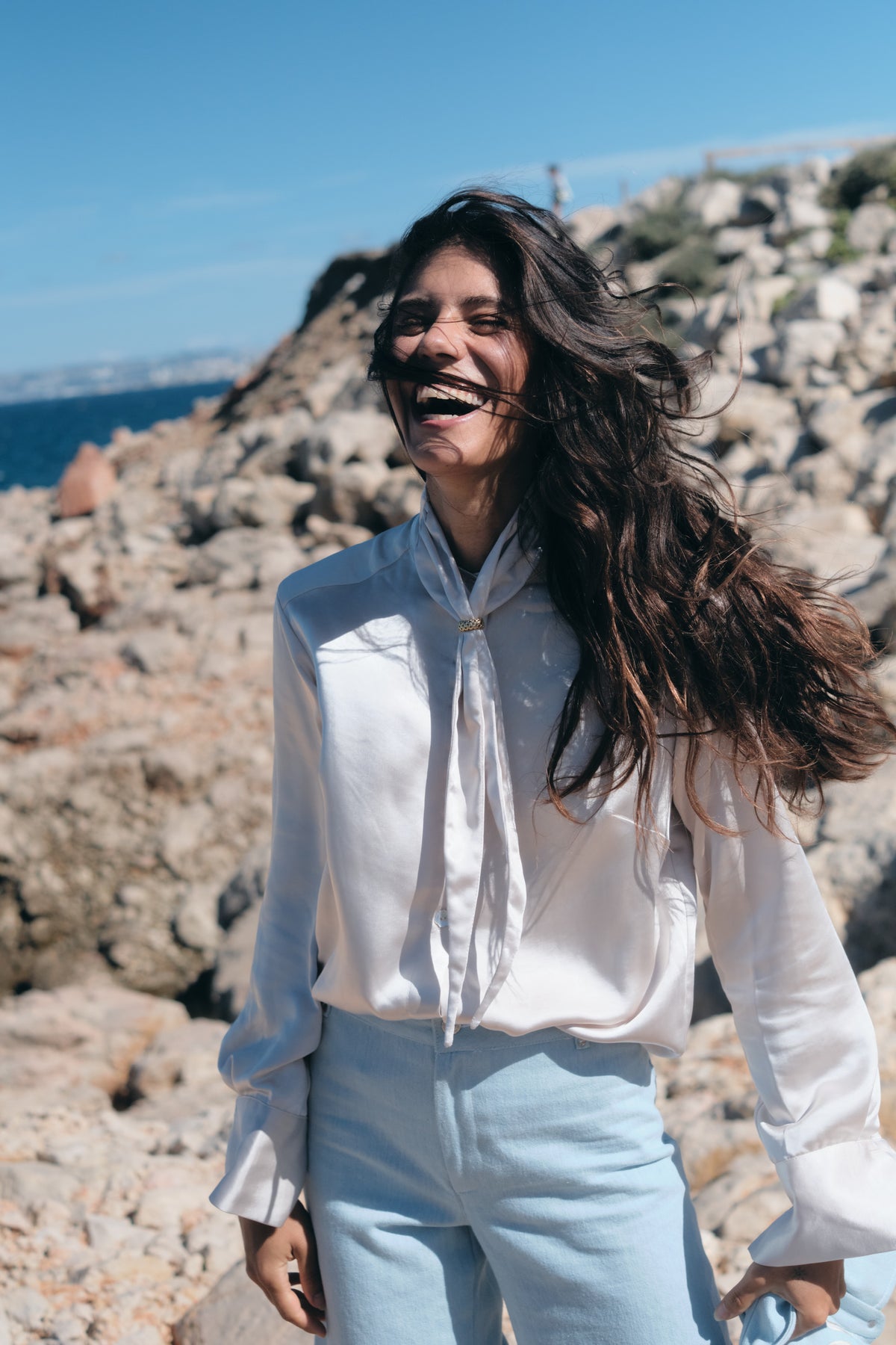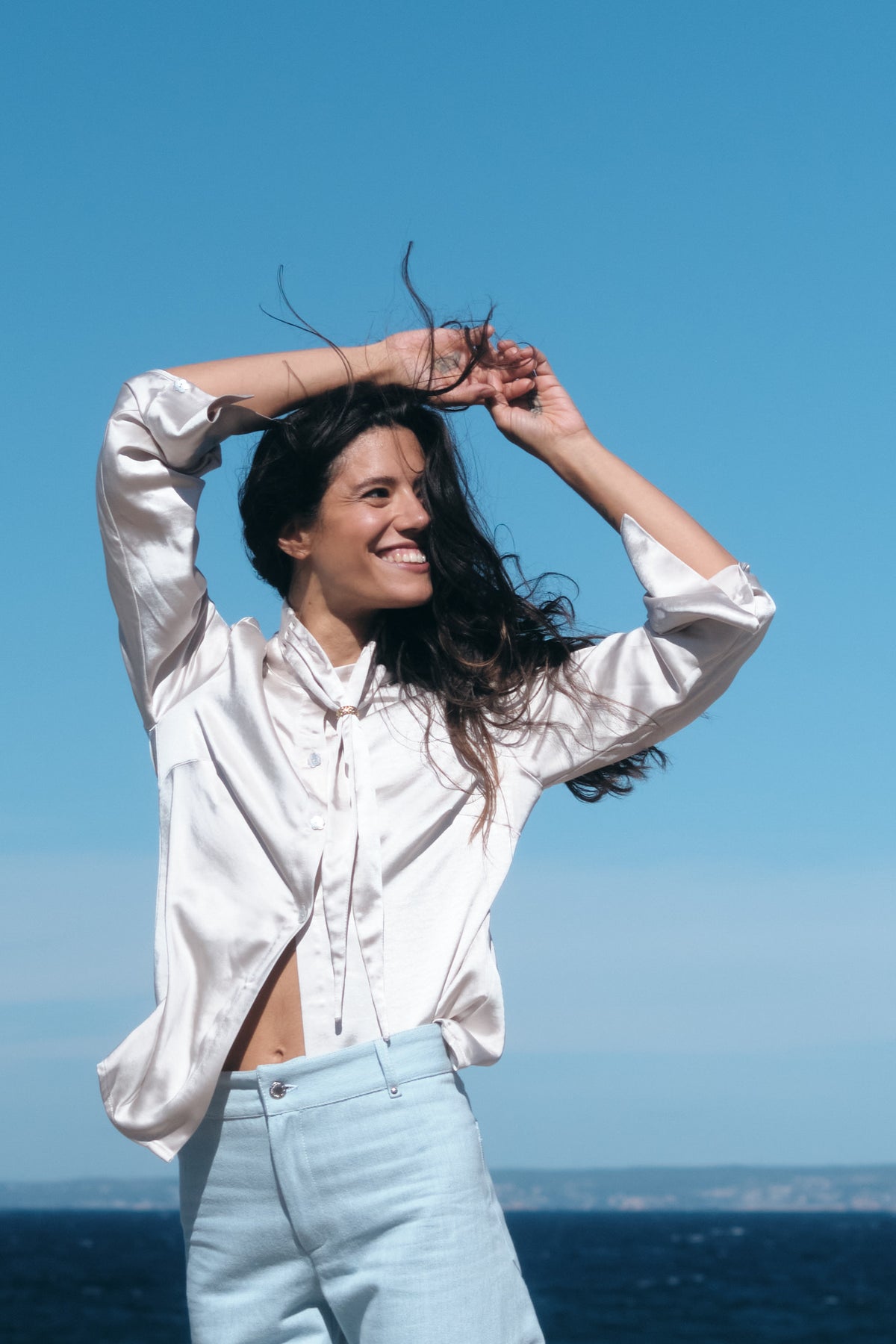 Introducing our latest addition to the VÂ repertoire - the Lady Tie Top. Cut in a heavy and reflective satin back crepe, this versatile and multifaceted top features a built-in scarf and tie, adding elegance, femininity, and sexiness to your wardrobe. Whether your mood calls for sophistication or playfulness, this top can adapt to any occasion, from meetings to cocktails and beyond. Truly a lady's companion, helping you express all aspects of your dynamic personality.