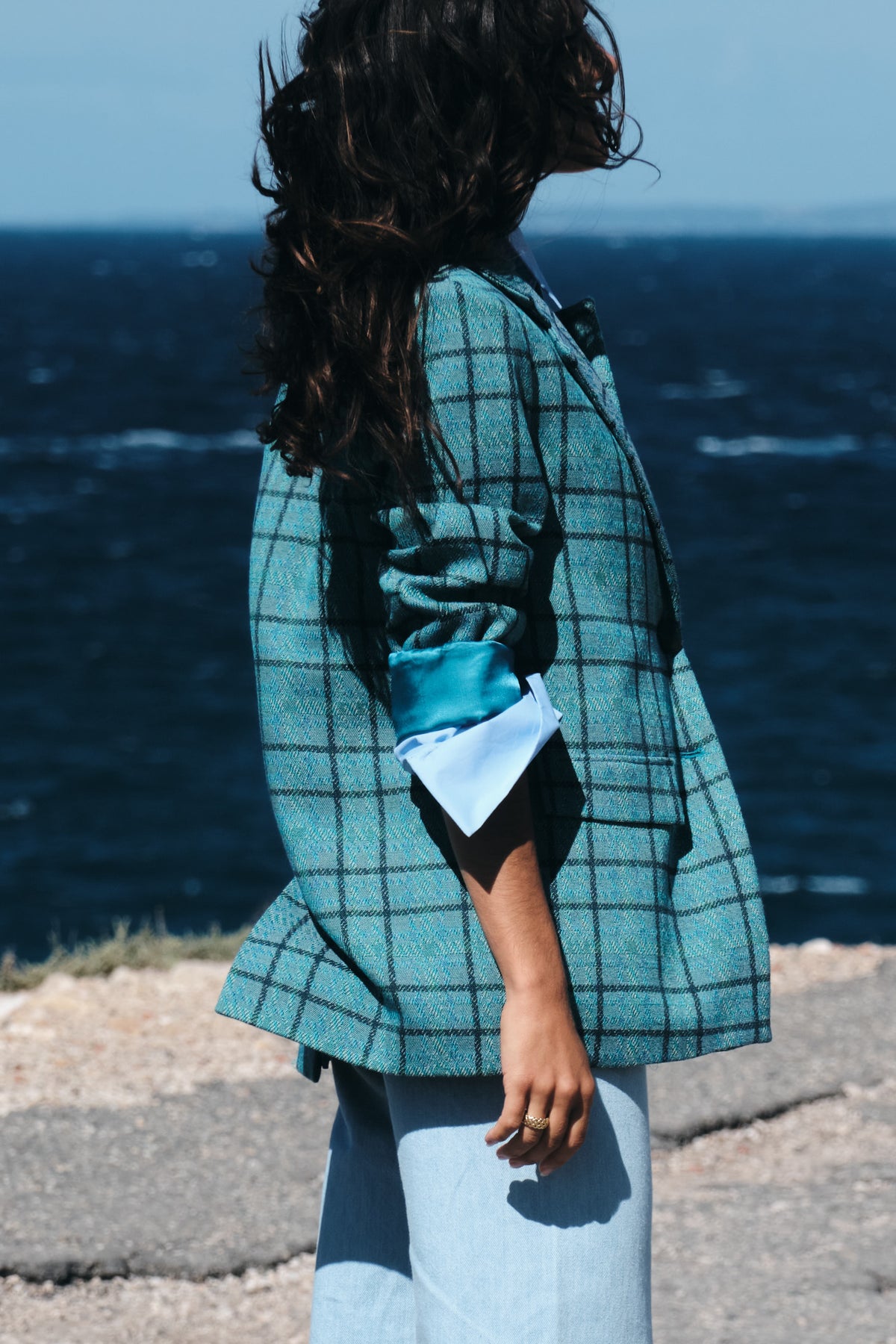 Our beloved Trailblazer D'Hiver is back, the best oversized but fitted blazer for the modern woman who means business. She stuns this season in a gorgeous turquoise and check wool blend cut on the wrong side to reveal the soul of this woven fabric. A must-have for any wardrobe, its perfectly tailored-yet-loose fit that allows for endless pairings and layering options (chunky sweaters included). From the office to weekend adventures, this versatile piece exudes feminine strength and will make you stand out wherever you go!