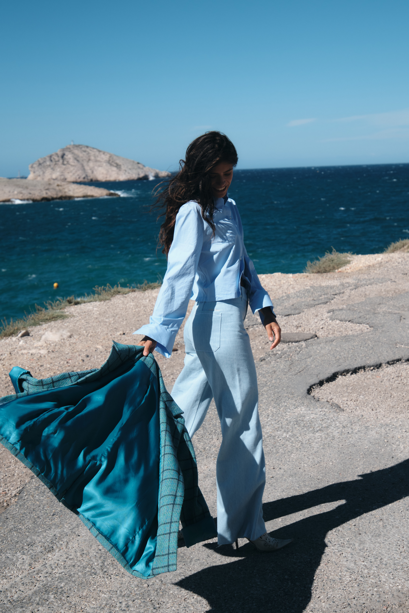 Soar through the season with us in our pre-fall collection S O A R, shot in les Goudes, Marseille, a small fishing village on the southern coast of France. This raw setting exposed to all the elements highlights our woman in all of her freedom, confidently taking flight in sustainable denim sets, silky crêpe back satins, tailored blazers and the cozy sweaters that envelop her.